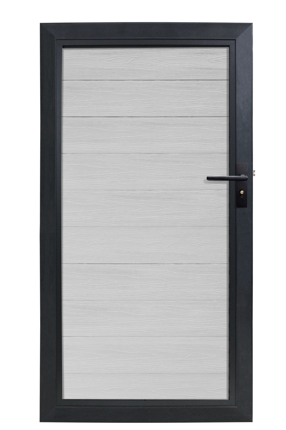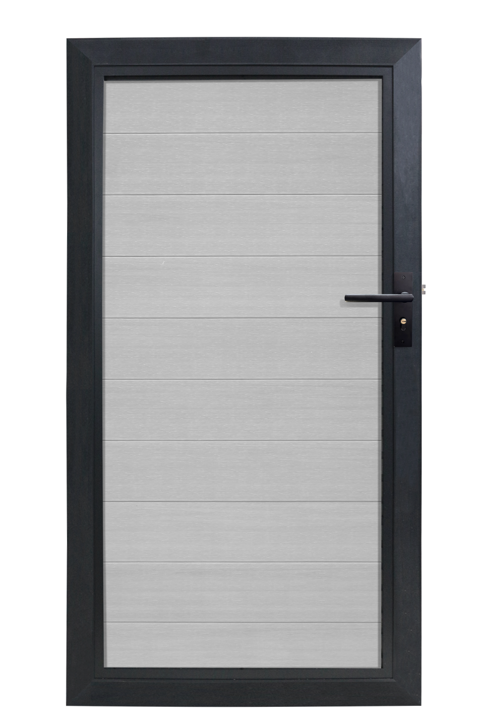 Een Composiet Tuindeur grijs word helemaal compleet geleverd, het enige dat je nodig hebt is onze aluminium composiet schutting paal. De tuinpoort scharnieren zijn tegen onze aluminium palen te schroeven, het zelfde geld voor de staatlijst. (beide kunnen ook tegen een muur bevestigd worden)