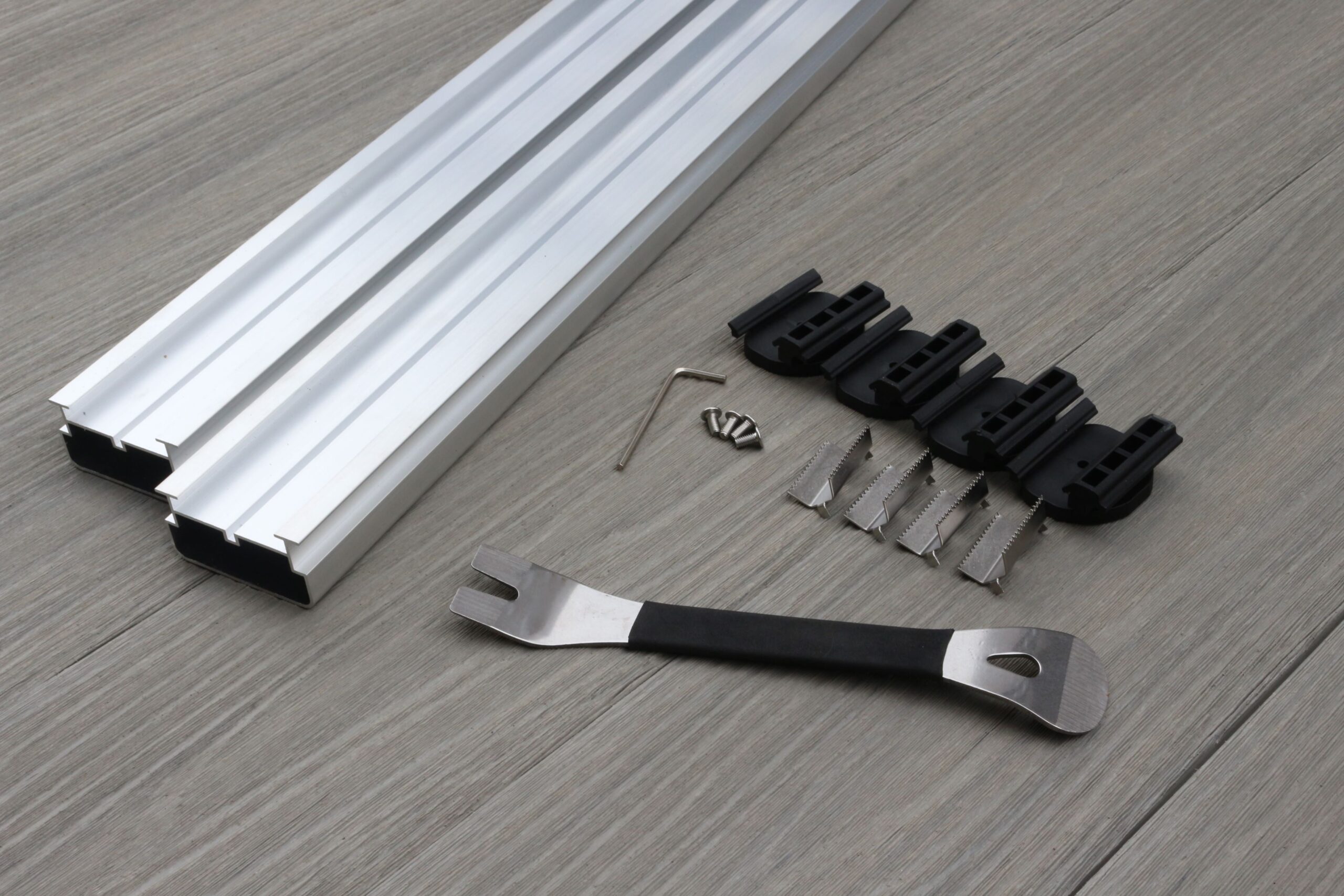 - Je kiest voor de plank met bevestiging materialen en aluminium onderregel. We leveren dan de plank en 13 clips voor bevestiging op de aluminium regel. per m2 leveren we 3 meter aluminium regelwerk.