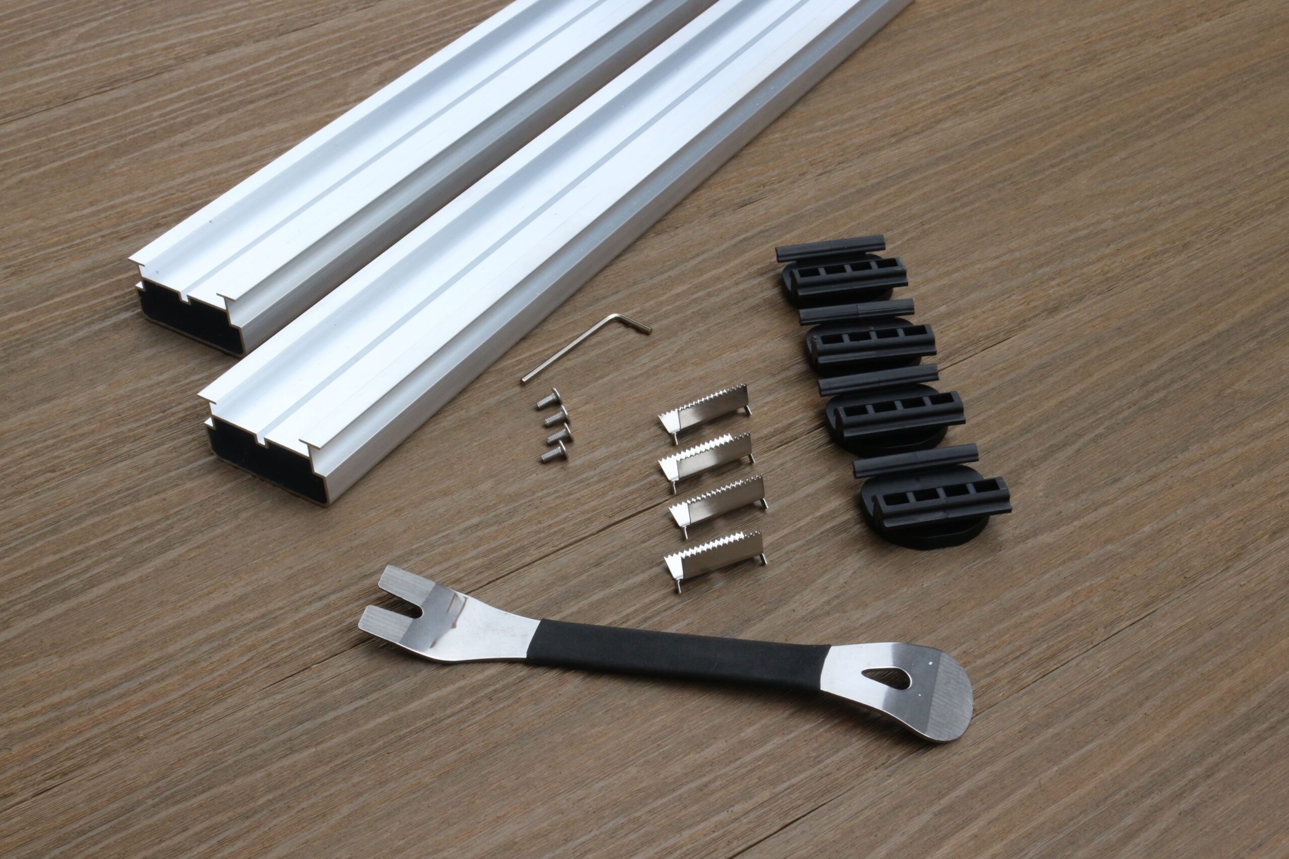 - Je kiest voor de plank met bevestiging materialen en aluminium onderregel. We leveren dan de plank en 13 clips voor bevestiging op de aluminium regel. per m2 leveren we 3 meter aluminium regelwerk.